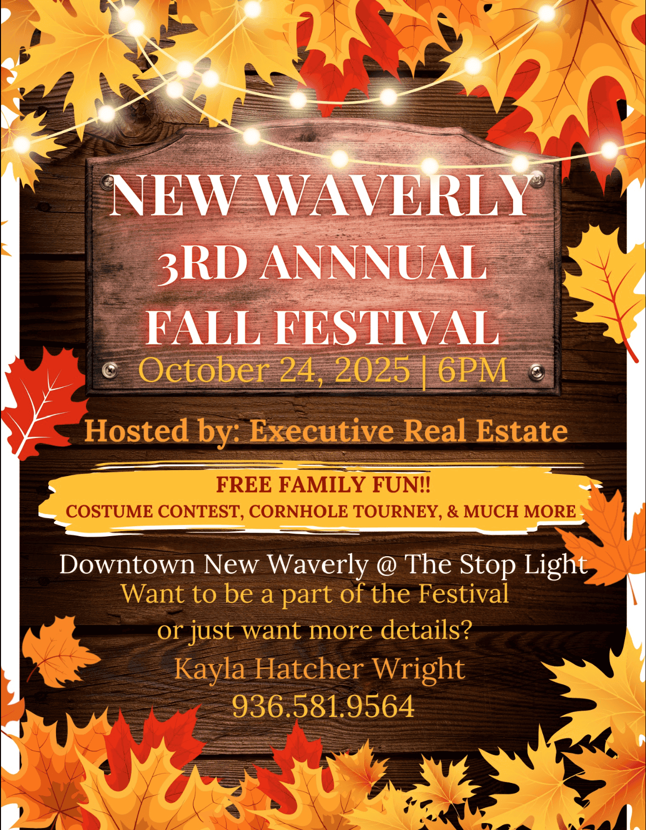 New Waverly 3rd Annual Fall Festival By |2025-10-26T17:42:11-05:00October 26th, 2025|Comments Off on New Waverly 3rd Annual Fall Festival Share This Story, Choose Your Platform! FacebookXRedditLinkedInWhatsAppTumblrPinterestVkXingEmail About the Author: